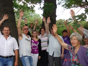 Радушные хозяева уже давно ожидали нас, сделав всё, чтобы гостям было уютно и удобно. В невероятно красивом месте, где позже мы смогли любоваться редкими для других мест цветами: ярко-красными головками клевера, пышными кустиками голубоглазой вероники, орхидееподобными ясенцами, а также огромными земляничными полянами и многими-многими другими шедеврами Природы, – под высокими тенистыми дубами были по кругу установлены скамьи и расстелены одеяла. А земля под ногами была такая мягкая, как перина, и большинство из нас сразу же сбросили обувь. Рядышком под деревьями мирно «дремал» самовар. Все присутствующие быстро образовали круг и приступили к Со-настройке, хотя, я думаю, этот процесс начался и у гостей, и у хозяев ещё с самого утра вместе с приятными хлопотами по организации встречи.